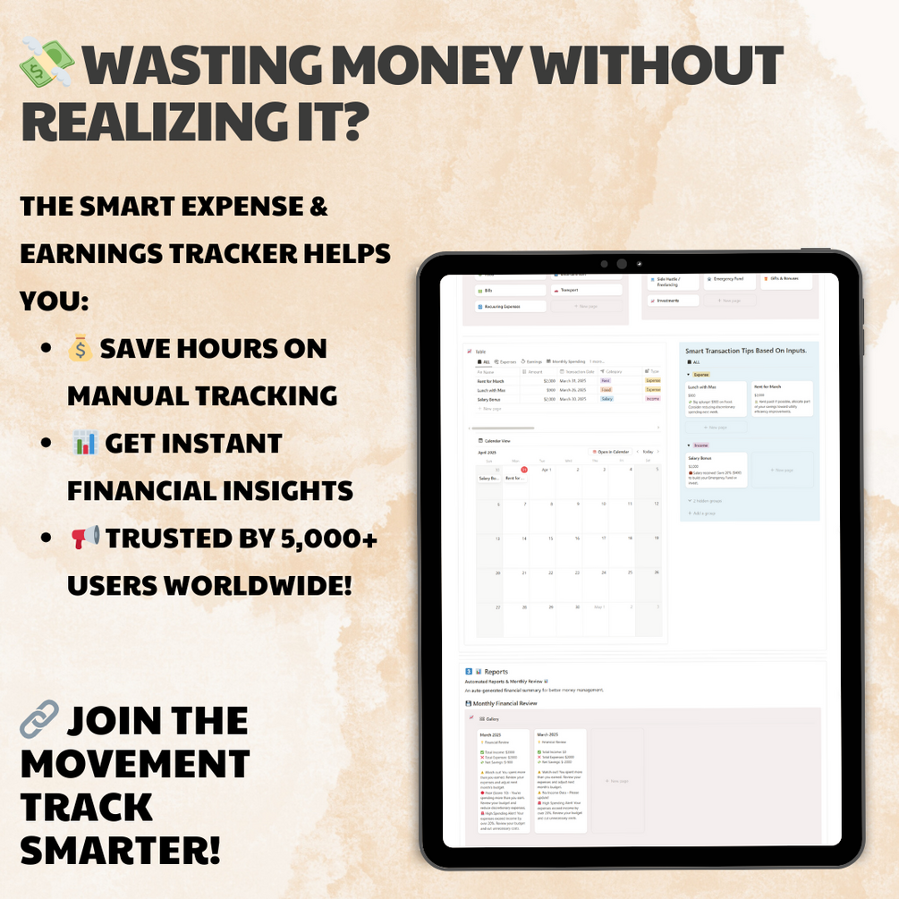 Managing your money doesnβt have to be complicated! The Smart Expense & Earnings Tracker is your all-in-one solution to track income, expenses, and savings effortlessly. Designed for freelancers, entrepreneurs, and anyone who wants financial clarity, this Notion-powered tracker helps you visualize, organize, and optimize your finances like a pro.