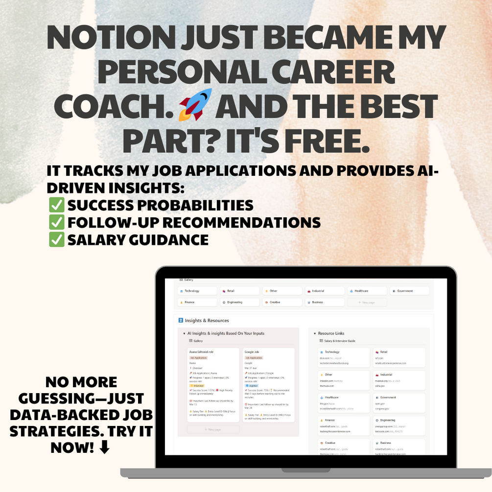 The AI-Powered Job Search Hub is a free Notion template designed to help job seekers track, optimize, and improve their job applications using AI-driven insights. Instead of manually managing applications and second-guessing outcomes, this tool provides real-time data-backed strategies to boost your chances of landing your dream job.